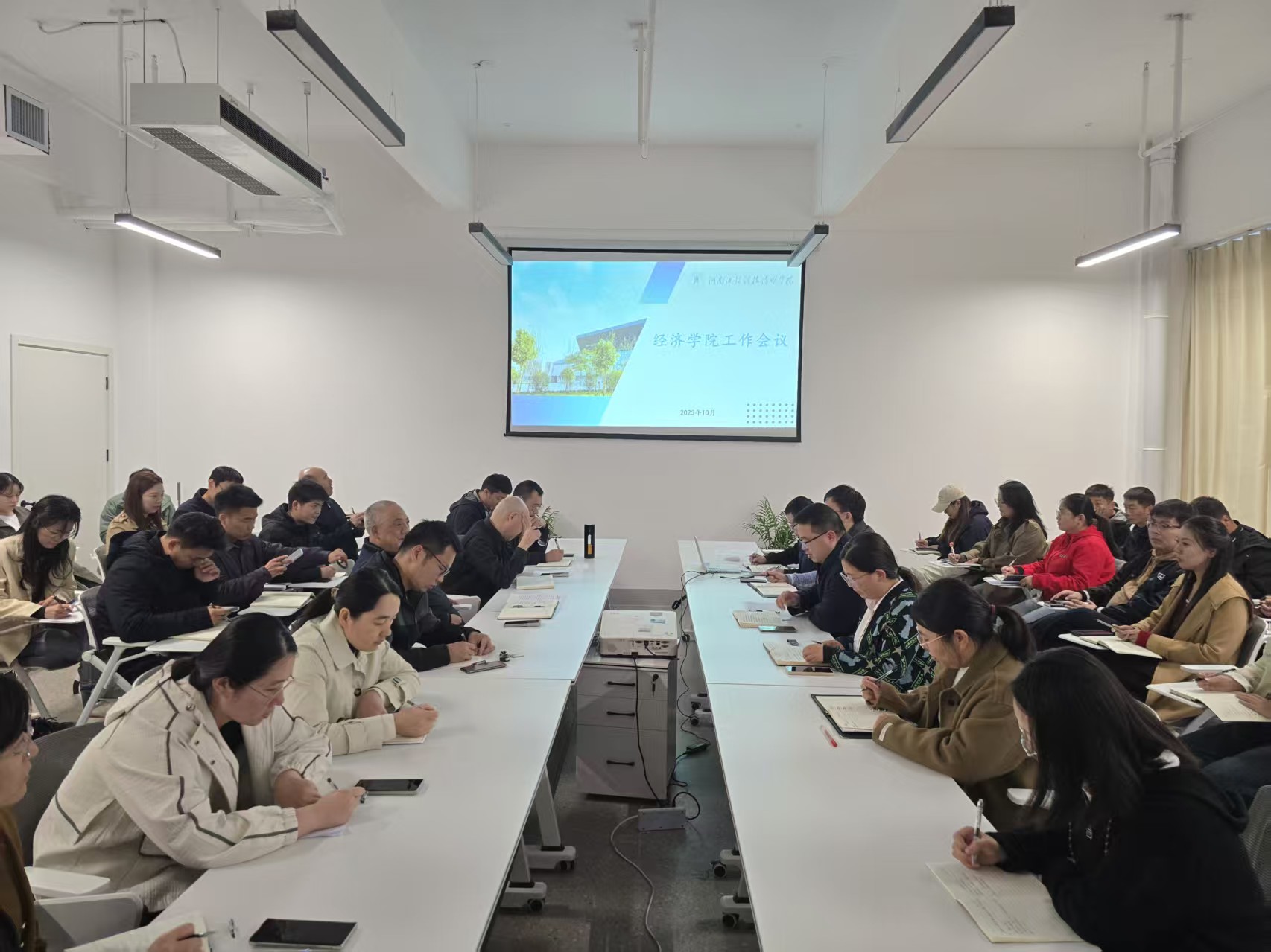 2025年10月9日下午,经济学院在至善楼02511会议室召开全体教职工会议,就学院近期重点工作进行部署和强调。学院领导班子及全体教职工出席本次会议。