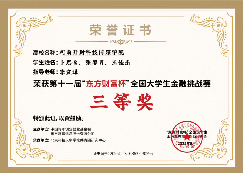 本次大赛是河南省高等教育学会2025年认定的河南省高等学校大学生学科竞赛省级竞赛C类项目,也是国内目前覆盖高校范围最广、参与学生规模最大、行业认可度最高的金融类学科竞赛之一。比赛共分为校赛、省赛和国赛三个阶段。金融系通过召开动员会和宣讲会等多种形式积极动员学生参加此次比赛,共有361支队伍参加校赛,经过奋力拼搏,48支队伍脱颖而出代表学校参加省赛;经过激烈角逐,最终获得省赛一等奖6项,二等奖5项,三等奖5项,并代表学校参加国赛;经过激烈拼杀,最终获得国赛一等奖2项,二等奖2项,三等奖4项,比赛成绩取得新突破。