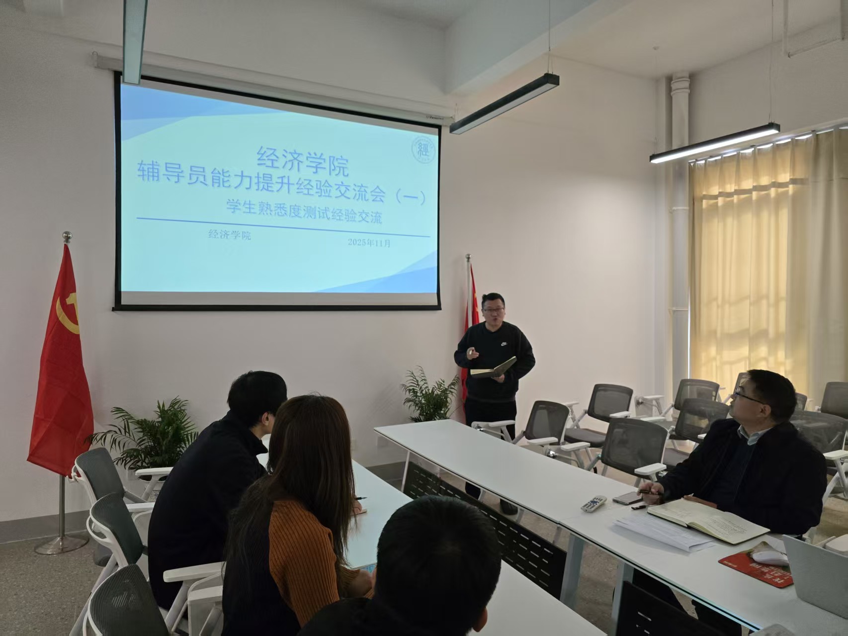 2025年11月21日,经济学院在至善楼02511会议室举办首场“辅导员能力提升经验交流会”,主题聚焦“学生熟悉度测试经验交流”。本次活动旨在加强辅导员队伍建设,提升其专业素养与工作效能,学院全体辅导员参会。