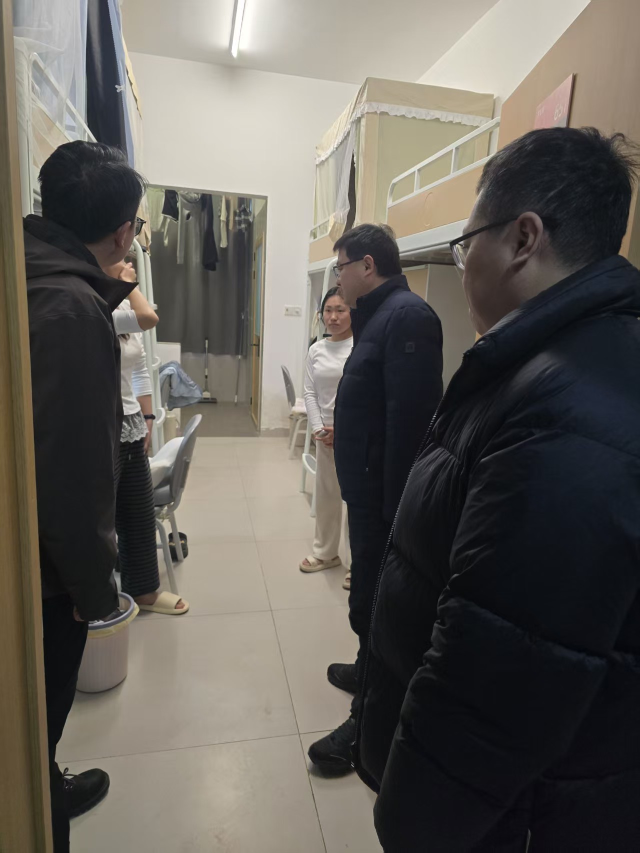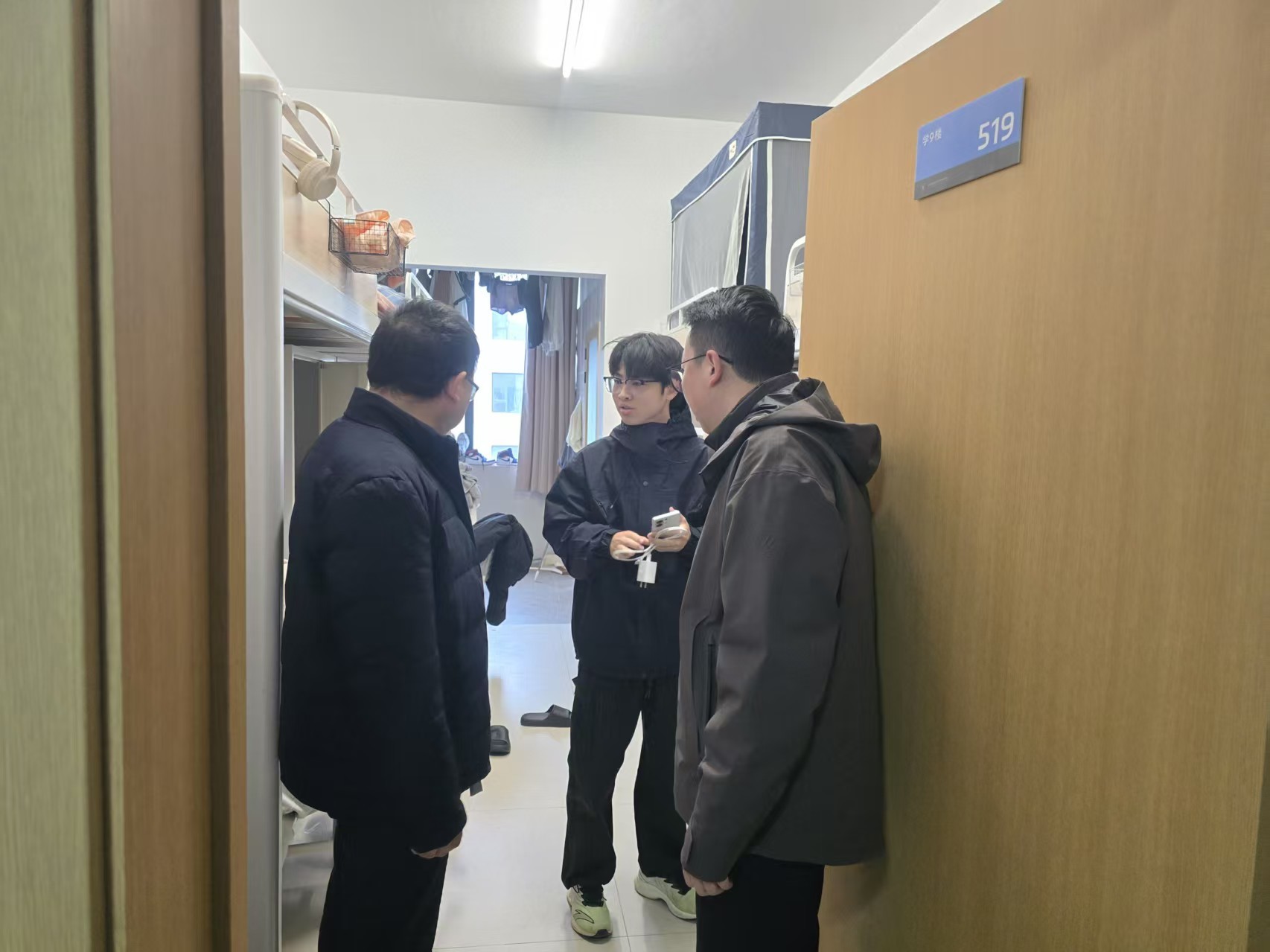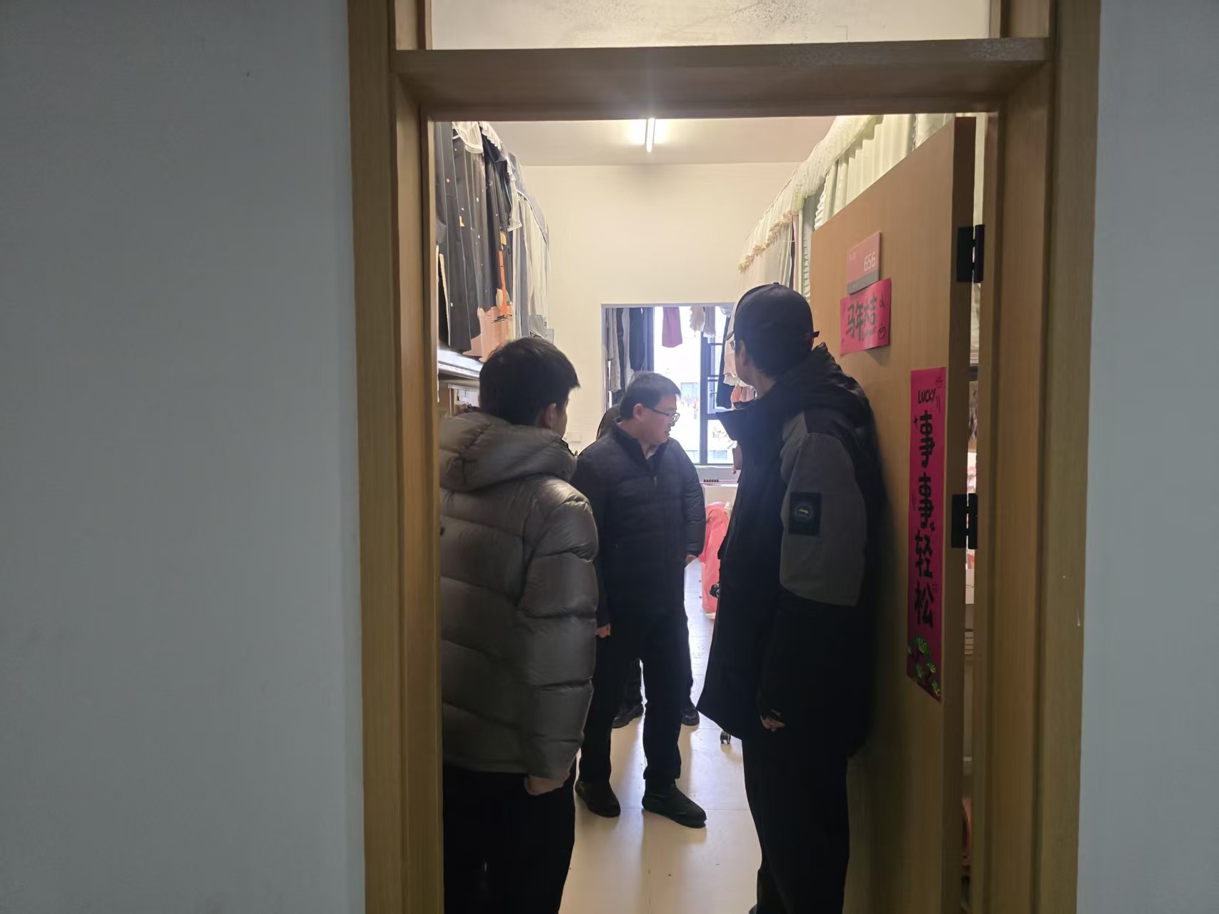 走访过程中,周荣超书记和辅导员老师与同学们亲切交流,细致了解大家的假期安排。对于计划离校的学生,他反复叮嘱要注意旅途安全,提前规划好行程,并保持通讯畅通;对于选择留校的同学,则重点提醒务必遵守宿舍管理规定,注意用电、防火及人身财产安全,合理安排学习与生活,度过一个平安、充实的假期。辅导员们认真检查了宿舍环境,排查潜在安全隐患。